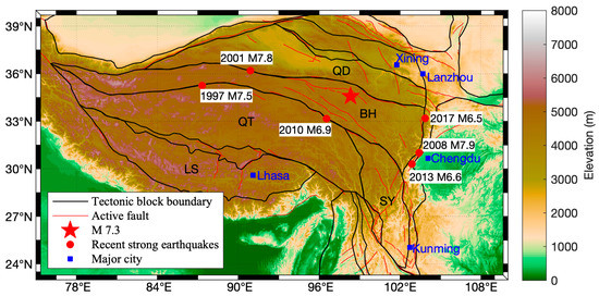 Distribution map of elevation, tectonic blocks in Tibetan Plateau, and the Madoi M 7.3 earthquake on 21 May 2021. The boundaries of active tectonic blocks originate from the work of Zhang et al. [39]. The 2021 Madoi earthquake was the largest one within the Bayan Har tectonic block, although a few major earthquakes have occurred along the boundary of this block over the past three decades. BH—Bayan Har block; QT—Qiangtang block; QD—Qaidam block; LS—Lhasa block; SY—Sichuan–Yunnan block.