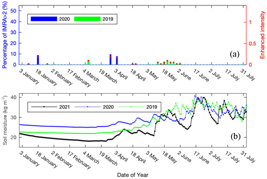 Time series of IMRA > 2 in the seismogenic fault zone (a) and soil moisture (b) during the period of January–July in 2019 and 2020.