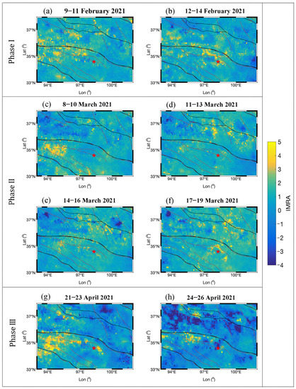 The spatial distributions of the IMRA around the epicentral region during phases I–III were also obtained for spatial analysis (Figure 5). During phase I (in mid-February 2021), high IMRA values were distributed along not only the seismogenic fault zone but also the boundary of the Bayan Har tectonic block (Figure 5a,b). However, during phases II and III (in mid-April and late-May), high IMRA values were distributed along the seismogenic fault zone (Figure 5c–h). The enhancement in the IMRA was observed along the faults in the adjacent block of Bayan Har (Figure 5a,d–h). It is worth noting that the distribution of the high IMRA values was closer to the seismogenic fault during phase III (Figure 5g,h).