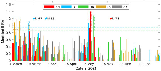 Time series of ILRA variations in different tectonic blocks in 2019 and 2021: (a) Bayan Har block—BH; (b) Qiangtang block—QT; (c) Qaidam block—QD; (d) Lhasa block—LS; and (e) Sichuan–Yunnan block—SY. The red star represents the Madoi M 7.3 earthquake, and black stars indicate two moderate earthquakes that occurred in the Qiangtang tectonic block.