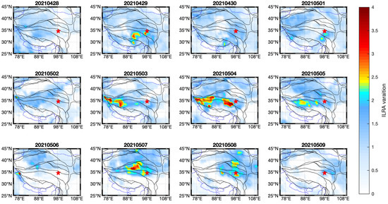 Furthermore, we obtained ILRA spatial variations during the period, and these showed distinct enhancements prior to the Madoi M 7.3 earthquake in ILRA time-series variations (red dash boxes in Figure 6). We clearly observed an increase in the ILRA on 29 April 2021 (22 days prior to the main event) and distributions around the epicentral region and its southwest region. Three days later, the distribution of the high ILRA extended to west and gradually covered most area of the Bayan Har block on 4 May 2021, which was the maximum enhancement in the Bayan Har block, as shown in Figure 6. Afterwards, the high ILRA values moved close to the epicenter and diffused to the north on 7–8 May 2021; then, they disappeared (Figure 7). It should be noted that the ILRA increase during this period occurred just after phase III of the increased IMRA (Figure 3b).