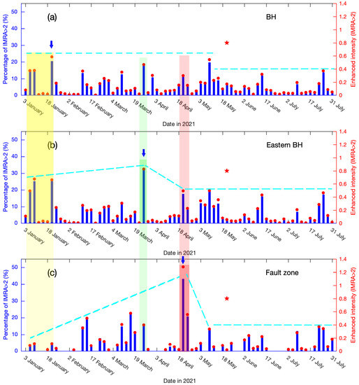 Three-day-averaged IMRA values were computed to avoid missing data due to the satellite orbital gaps. Earlier, we found high IMRA values mainly distributed along the seismogenic fault in other major earthquakes in the Bayan Har tectonic block [4,29]. Here, we firstly focused on the IMRA variation within the seismogenic fault (the region surrounded by green lines in Figure 2b). To obtain the extent of the enhanced IMRA in the seismogenic fault, the percentages of the IMRA pixels with various levels (IMRA > 1, IMRA > 2, IMRA > 3 and IMRA > 4) were computed within the fault zone from January to July 2021 (Figure 3a). By comparing the different IMRA limits, we found IMRA > 2 criteria to be an ideal choice for analyzing anomalous signals associated with the Madoi earthquake. At a lower threshold value (i.e., IMRA > 1), high percentages occurred frequently but were difficult to relate to earthquake activities. At higher threshold values (i.e., IMRA > 3 and IMRA > 4), possibly useful information was masked, which can be seen in the limited data indicated by blue and black bars in Figure 3a. It should be noted that threshold values could vary from place to place due to different seismogenic environments [50].