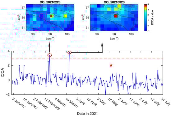 Spatial-temporal variation in the ICOA associated with the Madoi M 7.3 earthquake. The red dashed line indicates the threshold line with ICOA = 3. The red circles indicate the values exceeding the threshold line.