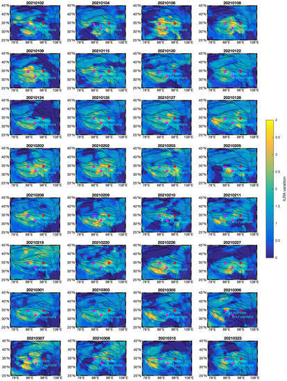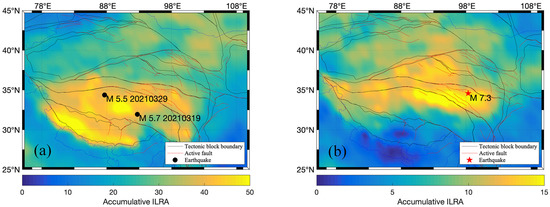 In view of the good response of the ILRA to the two moderate earthquakes that occurred in the Qiangtang block in March 2021 (Figure 10), we further produced and analyzed daily ILRA spatial distributions from January to March 2021. The data clearly showed the increased ILRA values frequently appeared in the epicentral region and its surrounding areas more than two months prior to the two moderate earthquakes in March 2021 (Figure 11). Within one month prior to the two events, e.g., 26 February, 5–7 March, and 15 March 2021, high ILRA values were repeatedly distributed along the India–Eurasia collision zone (Figure 11). Moreover, we computed the accumulated ILRA prior to the two moderate earthquakes and the M 7.3 event (Figure 12). For the M 5.5 and M 5.7 earthquakes in March 2021, the accumulative value of daily ILRA in February was computed. For the Madoi M 7.3 earthquake, the ILRA values during the period from 28 April to 8 May 2021 were used for the accumulation calculation. Prior to the two moderate earthquakes in March 2021, the high values of the accumulated ILRA were concentrated in between the epicenters of two earthquakes and along the India–Eurasia collision zone (Figure 12a). However, prior to the Madoi M 7.3 earthquake, high accumulative ILRA values were distributed in the epicentral area and its west region, which were in the Bayan Har block and its southern adjacent block (Figure 12b). Our results show a good correspondence between the high accumulative ILRA values and the seismogenic block and/or the epicenter of the impending strong earthquake.
