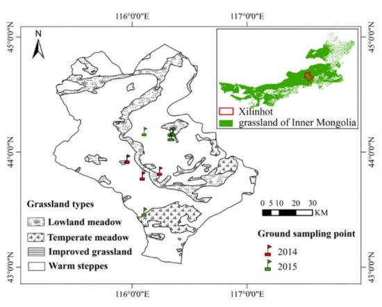 The ground sampling points (GSPs) data of Xilinhot in 2014 and 2015 were provided by the Institute of Agricultural Resources and Regional Planning, Chinese Academy of Agricultural Sciences. There were 3 sample plots and 9 GSPs in 2014, and 4 sample plots and 13 GSPs in 2015 (Figure 3). In the sample plots, each GSP should be separated by at least 250 m. The survey content mainly included sample plot number, GSP number, survey time, location, grassland type, terrain and altitude, latitude and longitude, dominant species, and SOS. As the basis of remote sensing application research, field observation plays a critical role in remote sensing modeling of vegetation phenology. The monitoring of the SOS in the field is mainly determined by the percentage of the plants (clumps) which begin to spread leaves and develop normally to the total plants (clumps) in the sample plot. The onset of SOS is indicated when the greening rate in the plot reaches 20%.