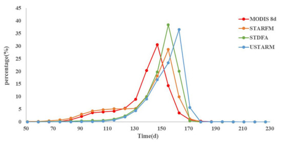 In spatio-temporal data fusion, when the Landsat data in the vicinity of the SOS is missing, the quality of the fusion image in the vicinity is reduced, resulting in a decrease in the inversion accuracy. The three algorithms of STARFM, USTARFM, and STDFA have poor predictive capabilities for this sudden disturbance information. However, the loss of Landsat image caused by the weather is unavoidable. At this time, we can choose the STARFM model to minimize the loss of accuracy caused by the lack of images.