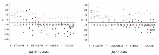 We compared the SOS retrieved from the fusion dataset (1d, 8d) with the SOS retrieved from the corresponding MODIS data in the study area (Figure 1), and evaluated the inversion effect of remote sensing datasets by measuring SOS on GSPs.