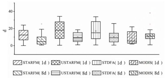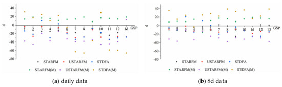 Figure 7 and Table 1, the SOS retrieved from 8d dataset was generally closer to the ground measured value, and the deviation distribution was more concentrated than the daily fusion data. The most concentrated data of the deviation distribution was , then and . The average absolute value of the deviation between the result and the measured value was the smallest at 8.7d, and the absolute value of the deviation of 50% of the sampling points was in the range of 3d–12.2d. Additionally, the absolute value of the deviation of the inversion using was the largest at 18d, and the absolute value of the deviation of 50% of the sampling points was concentrated in 8.5d–27.9d. The RMSE of and data were 11.3d and 14.3d respectively, which shown that remote sensing identification of vegetation SOS in Xilinhot based on MODIS data is feasible [48]. The RMSE of data inversion was the smallest, which was 9.7d, and the maximum RMES was 20.6d of the (Table 1). Among the fusion data, the inversion accuracy of the 8d data in the SOS was better than that of the daily fusion data and the data. The inversion accuracy of the and were higher than the . However, the accuracy of the daily fusion data inversion of the three algorithms was lower than that of the , while the accuracy of the was better than the .