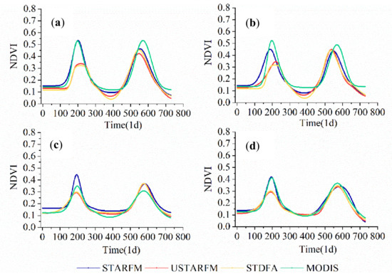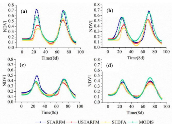 The high spatio-temporal resolution NDVI datasets (30 m, 1d) were constructed by three fusion algorithms and then composited at 8d intervals by the Maximum Value Composites (MVC) algorithm [44]. Therefore, there were 6 types of fusion data which expressed as , , , , , and , where indicated the fusion data type, n indicated the fusion algorithm, and indicated the time resolution.
