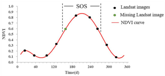 Firstly, we removed the Landsat data at the time point of the yellow rectangular box in Figure 2 (NO. 124029, the green dot in 2015). Then used continuous MODIS data to fuse with it to build high spatio-temporal resolution NDVI data. Next, we obtained SOS inversion by using NDVI data and its MVC 8d data, and compared them with the SOS inversion by using the measured data and the full data.