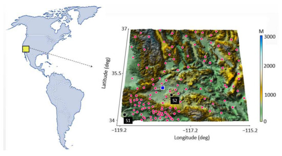 An area in North America has been selected to perform the methodology proposed. Measurements of 72 Global Positioning System (GPS) stations under various weather conditions and different topographies from 1995 to 2020 have been used for troposphere tomography. The distribution of the stations on the background of the topography can be seen in Figure 3. Not all stations are used at all epochs because of the lack of data in some stations at those epochs. The obtained results were validated using available radiosonde stations in the area. Radiosonde observations can measure atmospheric pressure, air-temperature, and relative humidity observations accurately; therefore, the use of this instrument is one of the most common methods to validate the outputs of troposphere tomography. The radiosonde data can be received for free form National Oceanic and Atmospheric Administration (NOAA). The location of the radiosonde station can also be seen in Figure 3.
