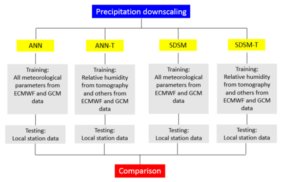 In this study, precipitation is modeled in four different ways: SDSM using ECMWF data (SDSM), SDSM using ECMWF data and tomography results (SDSM-T), ANN using ECMWF data (ANN), and ANN using ECMWF data and tomography results (ANN-T). Finally, the results of different approaches will be objectively compared with each other.