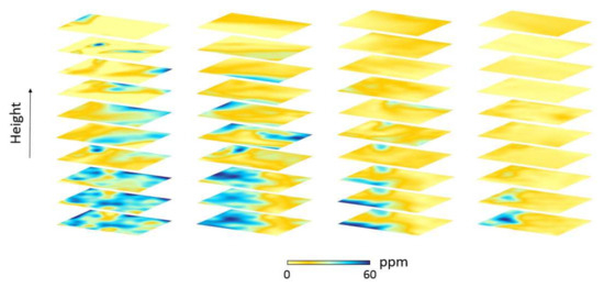 Samples of reconstructed wet refractivity field at epochs 14,124, 14,484, 14,844, and 15,204, from left to right.