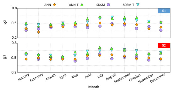 After performing the calibration step in the SDSM model, and thus, preparing the optimal ANN, it is necessary to compare the results of these two models with the observations of the two stations during the evaluation period from 2016 to 2020. For a fairer comparison, the results obtained for each month have been compared with the observations of that month, because it is expected that, in more rainy months, there will be a more significant difference between the results. Figure 10 shows the determination coefficient between observations and obtained precipitation from the different modes.