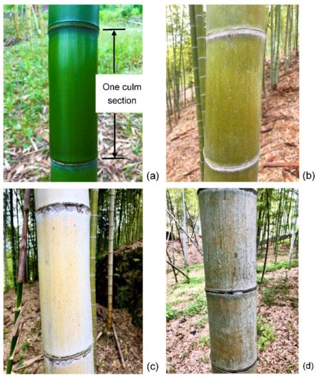 Photos of Moso bamboo culms of different du. (a) The 1-du bamboo; (b) The 2-du bamboo; (c) The 3-du bamboo; (d) The 4-du bamboo.