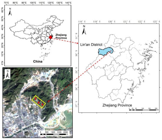 As shown in Figure 2, the test site is located in the managed Moso bamboo forest on the hill of Donghu Village, Lin’an District, Hangzhou City, Zhejiang Province, China (119°40′E, 30°15′N). The area has a subtropical monsoon climate with an average annual temperature of 16.4 °C and annual precipitation of 1500.0 mm to 1628.6 mm. The test site mainly contains Moso bamboo of different ages, from new growth to 6 years old, with a standing density of about 1200–2000 bamboo plants per hm2, as well as a few shrubs and weeds in the understory. There are no other trees in the bamboo forest. Within the test site, the elevation ranges from 50 m to 75 m and the slope from 15° to 27°.