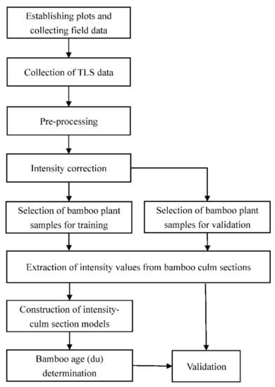 The workflow of bamboo age determination is shown in Figure 3. First, we established three sample plots in the Moso bamboo forest and collected the field data. We scanned the sample plots using a TLS instrument. The laser scanning data was pre-processed to derive point clouds. We then adopted an empirical intensity correction method to correct the effects of distance and incidence angle. Subsequently, a number of bamboo plants of different ages were selected and the corrected intensity data were extracted from each bamboo culm section. The laser intensity-culm section models were established to express the variation patterns of intensity with respect to culm section number, based on which the bamboo age could be determined. Finally, we selected some bamboo plants to validate the bamboo age determination method.