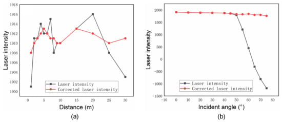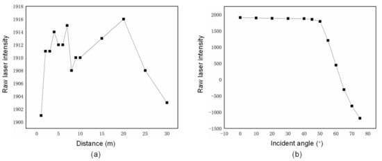 The relationship between raw laser intensity and distance or incidence angle. (a) The relationship between laser intensity and distance; (b) The relationship between laser intensity and incidence angle.