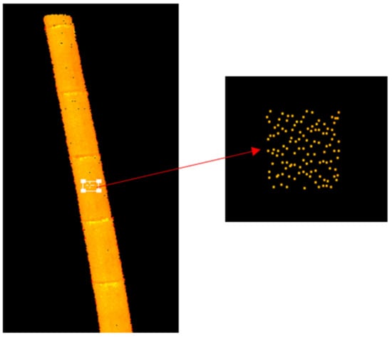 A total of 56 Moso bamboo plants, eight for each year from new growth to six years old, were selected to analyze the relationship between intensity and bamboo age. Using the software Cyclone, the culms of the selected bamboo plants were manually segmented from the point cloud. A single bamboo culm consists of multiple sections separated by bamboo joints (Figure 1). From the ground to the lowest branch, the culm sections were identified and numbered. A window of approximately 2 cm × 2 cm was used to extract laser points from the middle of each culm section (Figure 5). For a bamboo culm section, the laser intensity values within the window were corrected for the distance and incidence angle effects using the proposed correction model. Then the corrected intensity values were averaged to be taken as the laser intensity value for that section. As for different bamboo plants, the total number of culm sections below the lowest branch is not unified; the smallest total number (i.e., 17) of culm sections among all bamboo plant samples was adopted for the following analysis.