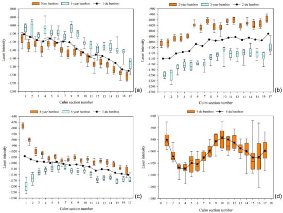 Laser intensity of Moso bamboo plants of different ages. For each du, the intensity value of a single culm section is the mean intensity value of all bamboo plants of the same du. The central lines within each box are the medians. The boxes’ edges represent the upper and lower quantiles. (a) The 1-du bamboo; (b) The 2-du bamboo; (c) The 3-du bamboo; (d) The 4-du bamboo.