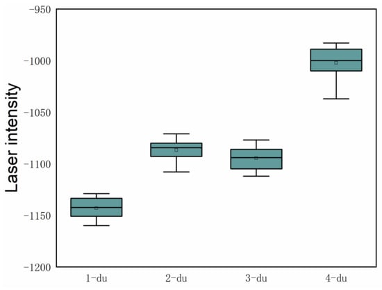 According to the existed studies, the laser intensity is strongly related to the spectral reflectance of targets [25]. The significant difference in intensity value among bamboo culms of different bamboo du is due to several factors related to the characteristics of Moso bamboo culms. The culm of 1-du bamboo contains a relatively high amount of chlorophyll and is emerald green in color. As the plant ages, the chlorophyll contained in the culm decreases. Hence, the culm color becomes light green first and then greenish-yellow or even grayish white. Because the laser scanner uses a 532 nm green laser, theoretically, the laser intensity values should decrease from bamboo du 1 to 4 with decreasing chlorophyll content. However, an opposite trend is shown in Figure 8, i.e., increasing intensity values from bamboo du 1 to 4. According to the experiments conducted under laboratory conditions, the rate of water content in the culm of 1-du Moso bamboo was about 73% and the water content decreased as bamboo du increased [38]. This may be one reason why the culm intensity values increased with bamboo age in our study. In addition, the material density of bamboo culms was observed to increase with bamboo age [39], which possibly affects the intensity values of bamboo culms of different bamboo du.