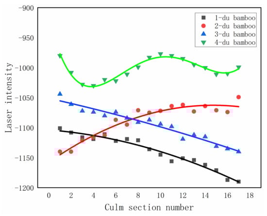 The culm section intensity values of bamboo plants of different ages are shown in Figure 6. For each du, the intensity values of two years’ bamboo plants were averaged from section to section as the intensity values of this du. For the 1-du bamboo, the intensity values of the culms of the new growth and the 1-year-old bamboo plants varied in the same pattern, with a decreasing trend from the first to the 17th bamboo section. The intensity values of the culms of the 2-year-old and the 3-year-old bamboo also showed the same variation pattern (Figure 6b), with an increasing trend from the first to the 17th bamboo section. The laser intensity values of the culms of the 4-year-old and the 5-year-old bamboo showed opposite variation patterns before the 6th bamboo section, with an increasing trend for the 5-year-old bamboo and a decreasing trend for the 4-year-old bamboo (Figure 6c). Both showed a decreasing trend after the 6th bamboo section. The data of the 4-du bamboo only contained the intensity values of the 6-year-old bamboo. The intensity values of the 4-du bamboo culms were mostly higher than the 1-du, 2-du, and 3-du bamboo culms (Figure 6d), showing no obvious trend. It should be noted that the intensity values of some bamboo sections, such as the 16th section of the 4-du bamboo, varied within a relatively large range among the bamboo plant samples. The reasons might be multiple. The intensity data collected from the sunlit or shady side of a culm would have different values, and the nonuniform culm color caused by scratches or diseases might also affect the intensity values.