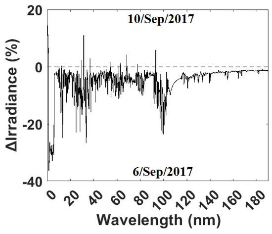 Figure 1 illustrates daily accumulated solar spectral irradiation provided by the FISM2 model for two days (6 September 2017 and 10 September 2017). The absolute values shown here do not allow to establish substantial differences between these two days. It should be noted that two peaks are observed with a maximum increase in radiation at wavelengths of 30.4 and 121.6 nm, which correspond to He II and the Lyman-alpha (Ly-) lines. The calculation of the relative difference in percent of the solar flare on 10 September to the flare on September 6 was performed to see which flare was stronger and in what wavelength range (Figure 2). The figure shows that the relative difference has predominantly negative values across the entire spectrum. This means that the outbreak on 6 September was stronger than the outbreak on 10 September.