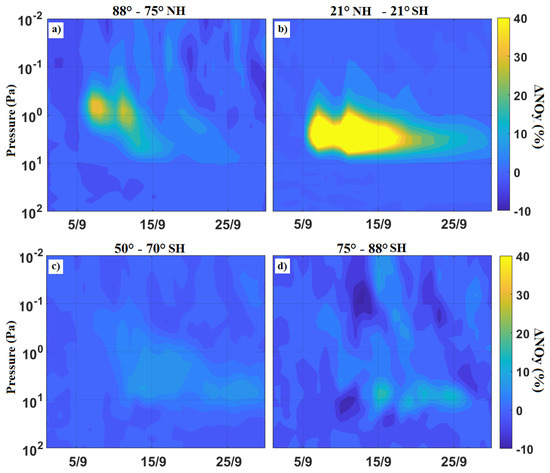 Figure 4 is similar to Figure 3 only for the odd nitrogen family (NO). It can be seen from the analysis of the figure that solar radiation during two solar flares on 6 and 10 September led to an increase in the content of the odd nitrogen family in the northern polar and equatorial latitudes up to 40%. The effect is most pronounced in the mesosphere (from 10 to 1 Pa). It is important to note that the increase in NO after the X8.2 solar flare on 10 September exceeds the effect after the more powerful X9.3 flare on 6 September. Figure 4 shows that in the tropical mesosphere, the increase in NO is 40% after the flare on 10 September, which exceeds the increase in NO after the stronger (see Figure 2) flare on 6 September. This is because the X9.3 flare leads to an increase in NO of NO photolysis, followed by the reaction NO + N = N + O and a decrease in NO. Moreover, the signal from solar flares of the odd nitrogen family lasts for two weeks, which proves the long lifetime of NO.