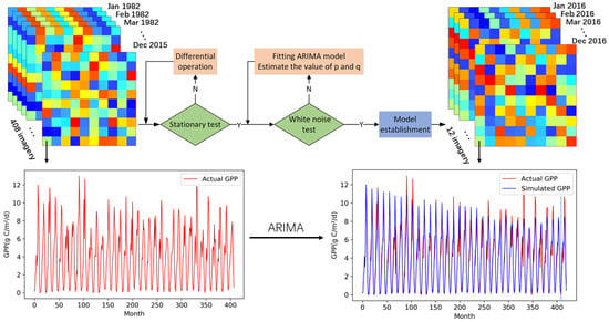 The time series ARIMA model is used for analysis and prediction. The time series data formed by samples changing with time are regarded as a random series. Its profile is simulated by fitting a best-fit ARIMA model according to the past and current values of the time series, and the built model is used to forecast future GPP values. Broadly, the establishment of the ARIMA model mainly has three processes: model identification, parameter and diagnostic checking, and prediction. After completing the three processes, we carefully selected the most suitable model from the above stages to predict the future values. Figure 2 shows the schematic workflow of the ARIMA model.