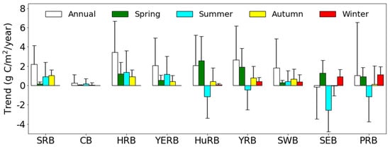 Seasonally, the four northern basins (SRB, CB, HRB and YERB) revealed an increasing trend in spring, summer and autumn, despite a stagnant period in winter, which was probably because of the low air temperature and SRAD in winter that leads to the stagnation of plant photosynthesis [56]. In the HuRB and the YRB, which are located in the central part of China, a significant increasing trend was detected in spring. Although there was a downward trend in summer, the ascending trends in the other seasons rendered the annual trend of the two basins to be rising. In the SEB and the PRB, statistically significant decreasing trends were found in summer. This can be attributed to the fact that high air temperature is more likely to occur in summer, which inhibits vegetation growth and is not conducive to increases in GPP [57]. Due to the increasing trend of GPP in spring and winter, the annual trend of the PRB exhibited an increasing state. The SEB was the only basin with a downward annual trend because of the decreasing trend in summer (−2.56 g C/m2/year). Nevertheless, the SWB maintained an upward trend consistent with the other three seasons in summer when the other basins in the south of China generally showed a downward trend. This can be explained by the fact that the SWB area has a high altitude and the terrain is mainly mountainous, which is not favorable to having extremely high air temperatures in summer [58]. On the whole, the noticeable discrepancies of the GPP trends in the nine river basins mainly occurred in summer, which mostly dominated the annual trend pattern of the basin.