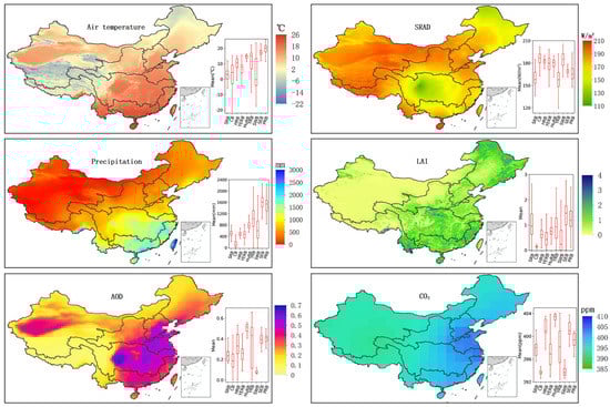 Annual mean of air temperature, downward shortwave radiation (SRAD), precipitation, leaf area index (LAI), and aerosol optical depth (AOD) from 1982 to 2015, and CO2 emissions from 2010 to 2015. The definition of box and whiskers on the lower right of each panel is the same as Figure 1.
