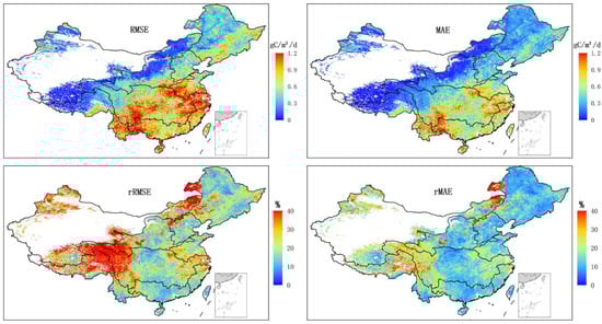 Spatial patterns of RMSE, MAE, rRMSE, and rMAE computed by the 12-month reference GPP values and predicted values using the ARIMA model in 2016. The nan value is displayed in white.