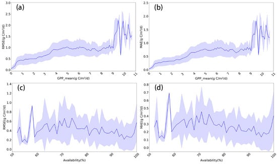 Earlier studies have demonstrated that the availability of data greatly affects the prediction ability of the ARIMA model [72]. The uncertainty of the ARIMA model regarding the data value range and data availability is shown in Figure 9. It is observed that pixels with poor availability are mainly distributed in the CB and the SWB, and the GPP values of these two regions are relatively low. The results indeed show that the model capability is closely related to data availability. The more available the data are, the better the forecast result will be, and vice versa. Moreover, the ability of the ARIMA model is noticeably affected by GPP values (Figure 9a,b). The curves of Figure 9c,d both show an upward trend in the availability of 100%. This is because the pixels with availability below 100% have lower GPP values than those with almost 100% data coverage, leading to their comparatively high accuracy. In other words, despite some places with poor data quality, the precision of GPP prediction is relatively high because of the low GPP values. All in all, the precision of the model is affected by the value and quality of the data together [73].