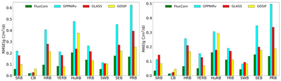 Figure 10 shows the temporal and spatial comparison of the monthly mean values of different GPP products. It is observed that five sets of GPP products are consistent in seasonality, i.e., the value is smaller in winter while the value reaches the peak in summer. Spatially, the coincident patterns occur in the SRB, the HRB and the YRB regions. Remarkable differences are found in the northwest inland region represented by the CB and the southeast coastal region represented by the SEB. The differences in the CB may be related to the lesser vegetation coverage and the inconsistencies of the GPP anomalies among different products. As for the SEB, the discrepancy in GPP values can be explained by the fact that different products are discordant in the quantification of the impact of the hydrothermal environment on GPP.