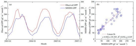 Comparison between the monthly observed GPP in Qianyanzhou flux tower and the monthly MODIS GPP (a) and their linear fitting (b) during 2003–2005.