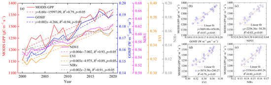 Temporal variations of annual mean MODIS GPP and GOSIF, NDVI, EVI, and NIRv (a) and their linear fit (b–e) during 2000–2020.