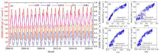Temporal variations of monthly mean MODIS GPP and GOSIF, NDVI, EVI, NIRv (a) and their polynomial fit (b–e) during 2000–2020. Note: N indicates the data size.