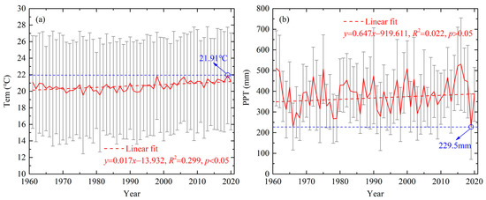 Temporal variations of Tem (a) and PPT (b) over the MLRYR from August to November during 1961–2020.