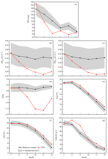 - From July to December, the PPT, SMsurf, SMroot, and SPEI in 2019 were generally below the averages during 2011–2020 and reached their lowest point in November, while those of Tem, LST, and PAR, on the contrary, were higher. Similar results could also be verified from the standardized anomalies of the above variables on the spatial.