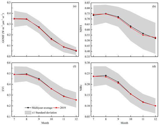 Variations of GOSIF (a), NDVI (b), EVI (c), and NIRv (d) from July to December 2019. Note: The black curves denote the multi-year monthly averages of these variables during 2011–2020; the red curves denote the monthly average of these variables in 2019; the grey shaded areas denote the ±1 standard deviation of the multi-year monthly averages.