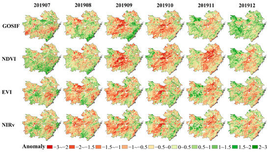 Spatial distributions of the standardized anomalies of GOSIF, NDVI, EVI, and NIRv from July to December 2019.
