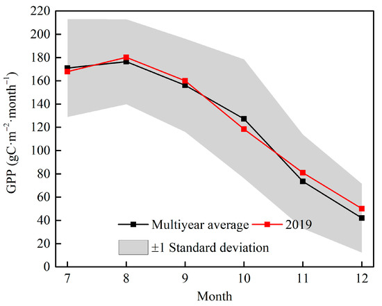 Variation of MODIS GPP from July to December in 2019. Note: The black curve denotes the multi-year monthly average of GPP during 2011–2020; the red curve denotes the monthly average GPP in 2019; the grey shaded areas denote the ±1 standard deviation of the multi-year monthly averages.