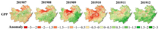 As shown in Figure 11, the monthly variations of GPP during July–December 2019 were consistent with GOSIF and VIs in Figure 9, and generally exhibited a gradually decreasing trend. In addition, the GPP in July and October of 2019 was slightly lower than the monthly average during 2011–2020, especially in October (the difference is 8.8 gC·m−2·month−1); however, in other months of 2019, the GPP was higher, especially in November and December (the differences are 7.3 gC·m−2·month−1 and 8.2 gC·m−2·month−1, respectively).
