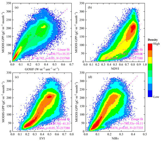 Scatter fitting between MODIS GPP and GOSIF (a), NDVI (b), EVI (c), and NIRv (d) during July–December 2019. Note: Each dot denotes the monthly value for each pixel (0.05° × 0.05°); N indicates the data size.