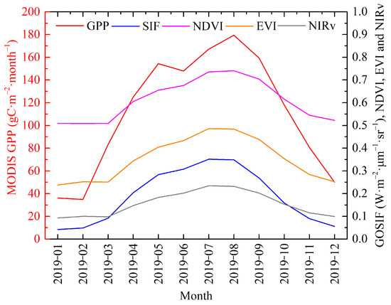 Monthly variations of MODIS GPP, GOSIF, NDVI, EVI, and NIRv in 2019.
