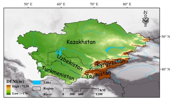 The study area covers Central Asia, which is positioned deep in the hinterland of the Eurasian continent. It spans 46°29′–87°18′E from east to west and 35°07′–55°26′N from north to south, covering a total area of about 4 × 106 km2. The administrative regions within this boundary include Kazakhstan (Kaz), Turkmenistan (TKM), Uzbekistan (UZB), Kyrgyzstan (KGZ), and Tajikistan (TJK) (Figure 1).