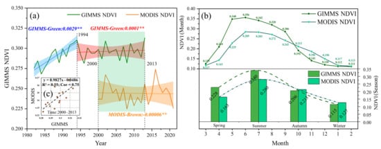Additionally, GIMMS NDVI was higher in spring (0.225) than in autumn (0.206), and MODIS was higher in autumn than spring (0.215). Due to the inconsistency of the products, GIMMS NDVI is higher than MODIS NDVI in spring and summer (March–September) but lower in autumn and winter (October–February). In other words, the annual variation range of GIMMS NDVI is higher than that of MODIS NDVI, as shown in Figure 4b. The figure also shows that GIMMS NDVI is more sensitive to monthly (seasonal) changes in the year than MODIS NDVI, which may be reflected in the difference in the sensor’s band calculation (Figure 3b).