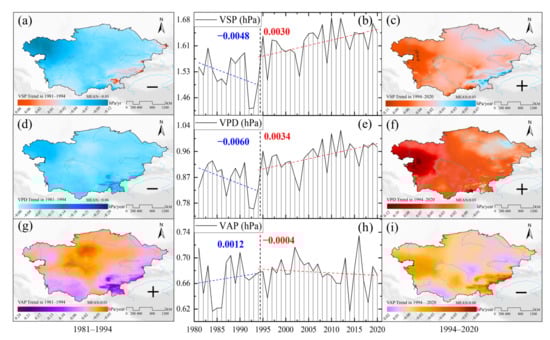 Temporal and spatial variation trends for VSP, VPD, and VAP. For 1981–1994: (a) VSP, (d) VPD, and (g) VAP; for 1994–2020: (c) VSP, (f) VPD, and (i) VAP; for 1981–2020: Segmentation time trends in (b) VSP, (e) VPD, and (h) VAP before and after 1994, respectively.