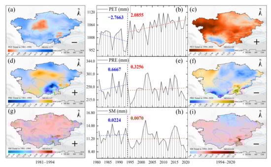 Temporal and spatial trends of PET, PRE, and SM: 1981–1994: (a) PET, (d) PRE, and (g) SM; 1994–2020: (c) PET, (f) PRE, and (i) SM; for 1981–2020: Segmentation time trends in (b) PET, (e) PRE, and (h) SM before and after 1994, respectively.