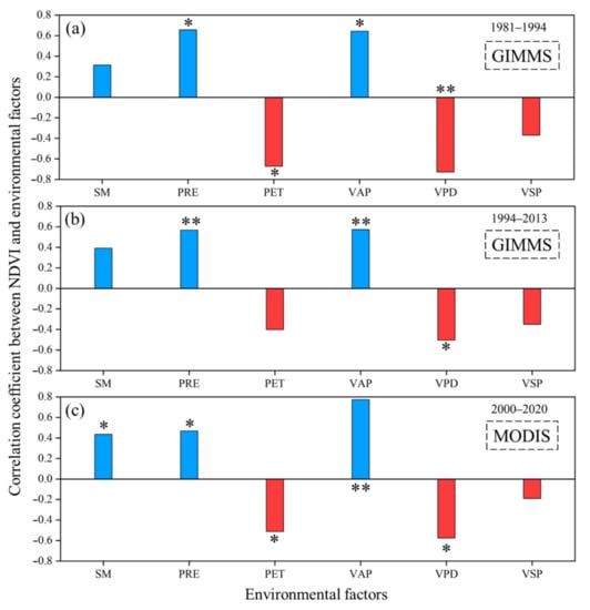 Average annual correlation between environmental factors (SM, PRE, PET, VAP, VPD, and VSP) and NDVI: (a,b) average annual correlations about GIMMS NDVI before and after 1994, respectively; (c) average annual correlations about MODIS NDVI from 2000 to 2020. Note that * indicates significance (p < 0.05) and ** indicates extreme significance (p < 0.01).